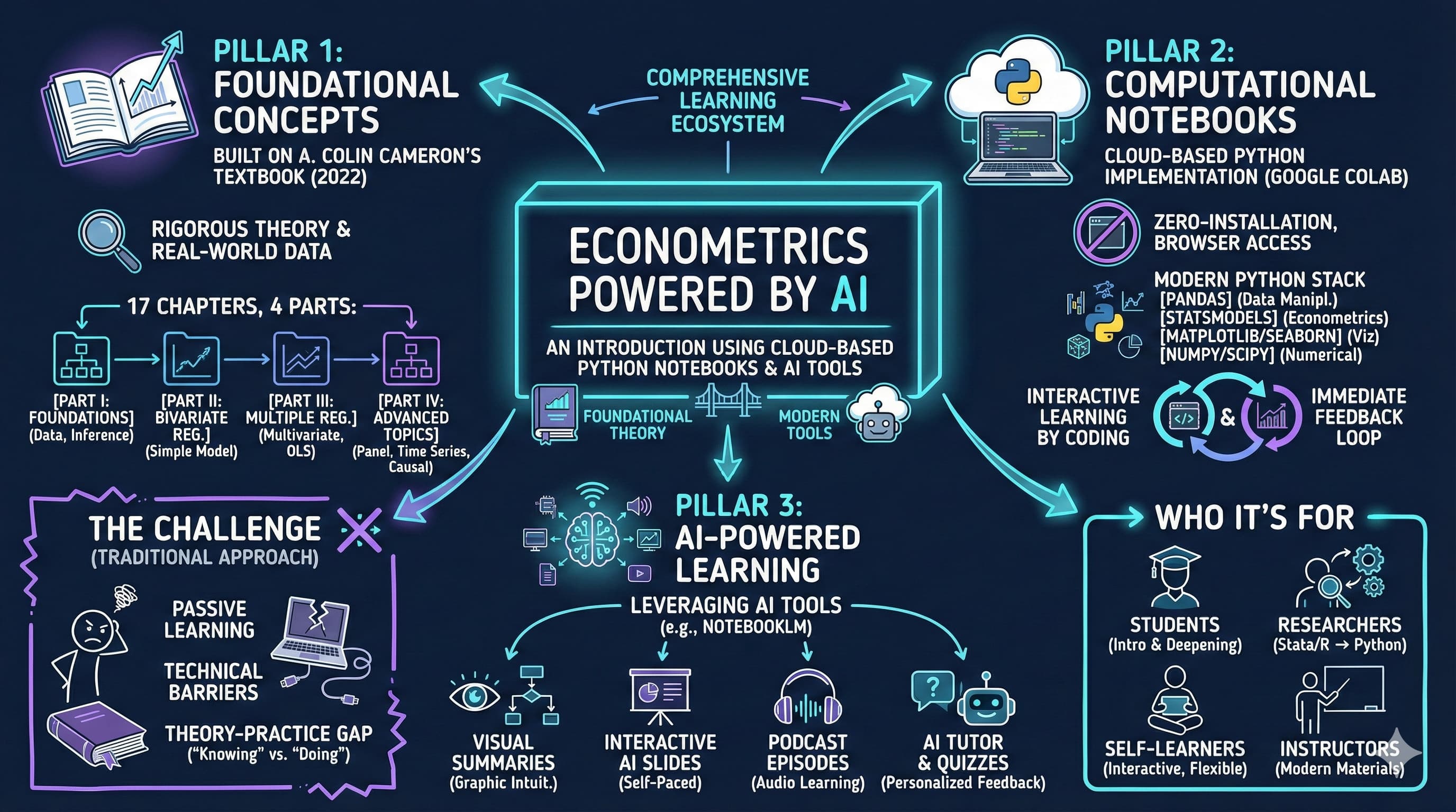 At the heart of this approach is a three-pillar methodology that combines Foundational Concepts, Computational Notebooks, and AI-Powered Learning. These three pillars work together to create a comprehensive learning ecosystem that addresses the limitations of traditional econometrics education while leveraging the best of what modern technology offers.