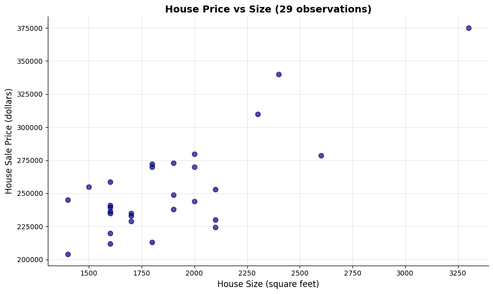 # Create scatter plotfig, ax = plt.subplots(figsize=(10, 6))# Plot the data pointsax.scatter(data_house['size'], data_house['price'], color='navy', s=50, alpha=0.7)# Labels and formattingax.set_xlabel('House Size (square feet)', fontsize=12)ax.set_ylabel('House Sale Price (dollars)', fontsize=12)ax.set_title('House Price vs Size (29 observations)', fontsize=14, fontweight='bold')ax.grid(True, alpha=0.3)ax.spines[['top', 'right']].set_visible(False)plt.tight_layout()plt.show()print("\nWhat do you see?")print("- Positive relationship: Larger houses tend to have higher prices")print("- Roughly linear: The points follow an upward-sloping pattern")print("- Some scatter: Not all points lie exactly on a line (this is the 'error')")