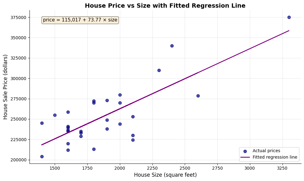 # Fit OLS regression: price ~ size# The formula syntax is: 'dependent_variable ~ independent_variable'model = ols('price ~ size', data=data_house).fit()# Display the full regression outputprint("="*70)print("OLS REGRESSION RESULTS: price ~ size")print("="*70)print(model.summary())