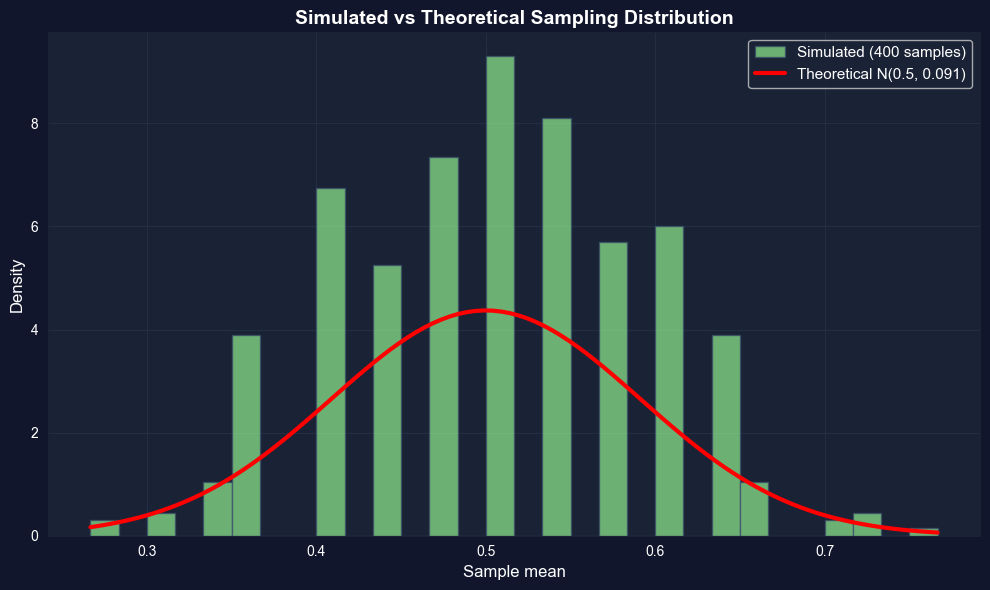 # Load precomputed coin toss means data (400 samples of size 30)data_cointoss = pd.read_stata(GITHUB_DATA_URL +'AED_COINTOSSMEANS.DTA')print("="*70)print("400 COIN TOSS EXPERIMENTS (each n = 30)")print("="*70)xbar = data_cointoss['xbar']print(f"\nSummary of 400 sample means:")print(data_cointoss.describe())print(f"\nFirst 5 sample means: {xbar.head().tolist()}")print(f"\nMean of the 400 sample means: {xbar.mean():.4f}")print(f"Std dev of the 400 sample means: {xbar.std():.4f}")print(f"\nTheoretical predictions:")print(f" E[X̄] = μ = 0.5000")print(f" σ(X̄) = σ/√n = √(0.25/30) = {np.sqrt(0.25/30):.4f}")print(f"\nComparison:")print(f" Empirical mean: {xbar.mean():.4f} vs Theoretical: 0.5000")print(f" Empirical std: {xbar.std():.4f} vs Theoretical: {np.sqrt(0.25/30):.4f}")print("\nExcellent agreement between theory and experiment!")