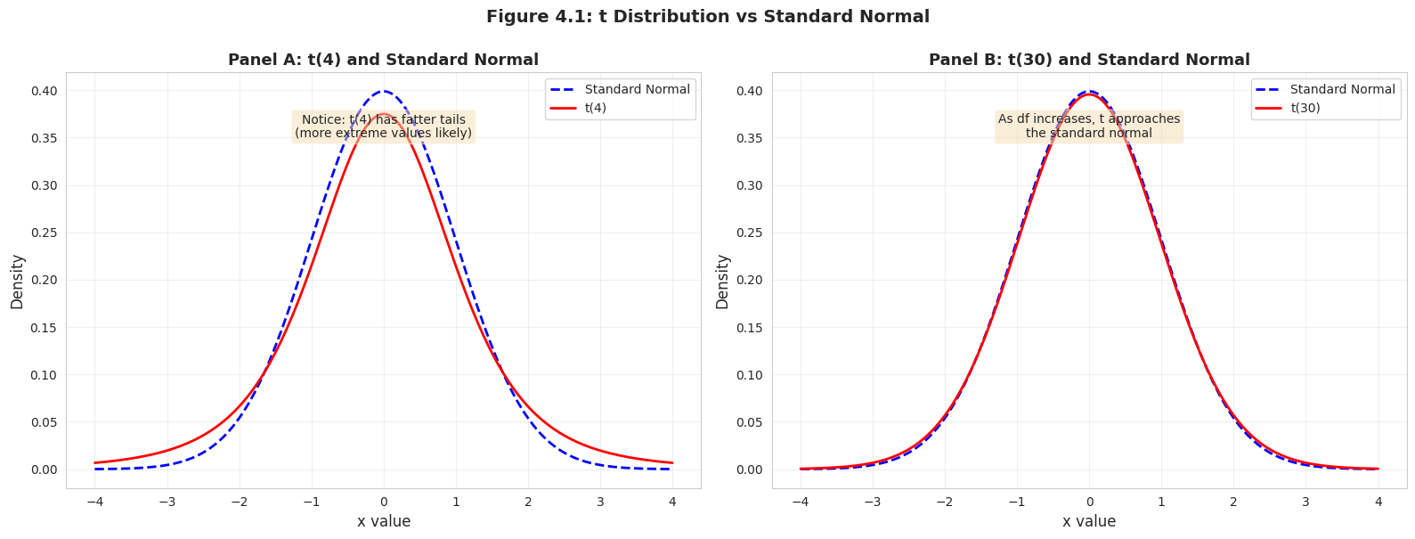 # Visualize t-distribution vs standard normalfig, axes = plt.subplots(1, 2, figsize=(16, 6))x = np.linspace(-4, 4, 200)# Panel A: t(4) vs standard normalaxes[0].plot(x, stats.norm.pdf(x), 'b--', linewidth=2, label='Standard Normal')axes[0].plot(x, stats.t.pdf(x, df=4), 'r-', linewidth=2, label='t(4)')axes[0].set_xlabel('x value', fontsize=12)axes[0].set_ylabel('Density', fontsize=12)axes[0].set_title('Panel A: t(4) and Standard Normal', fontsize=13, fontweight='bold')axes[0].legend()axes[0].grid(True, alpha=0.3)axes[0].text(0, 0.35, 'Notice: t(4) has fatter tails\n(more extreme values likely)', ha='center', bbox=dict(boxstyle='round', facecolor='wheat', alpha=0.5))# Panel B: t(30) vs standard normalaxes[1].plot(x, stats.norm.pdf(x), 'b--', linewidth=2, label='Standard Normal')axes[1].plot(x, stats.t.pdf(x, df=30), 'r-', linewidth=2, label='t(30)')axes[1].set_xlabel('x value', fontsize=12)axes[1].set_ylabel('Density', fontsize=12)axes[1].set_title('Panel B: t(30) and Standard Normal', fontsize=13, fontweight='bold')axes[1].legend()axes[1].grid(True, alpha=0.3)axes[1].text(0, 0.35, 'As df increases, t approaches\nthe standard normal', ha='center', bbox=dict(boxstyle='round', facecolor='wheat', alpha=0.5))plt.suptitle('Figure 4.1: t Distribution vs Standard Normal', fontsize=14, fontweight='bold', y=1.0)plt.tight_layout()plt.show()print("\n📊 Key Observation:")print(" With more degrees of freedom (larger n), the t-distribution looks more like the normal.")print(" For n > 30, they're nearly identical.")