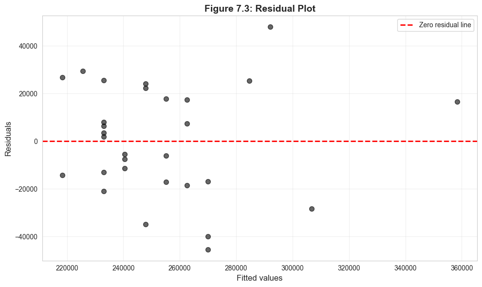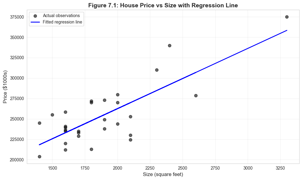 # Table 7.1 - Basic regressionprint("="*70)print("Table 7.1: Regression of House Price on Size")print("="*70)model_basic = ols('price ~ size', data=data_house).fit()print(model_basic.summary())