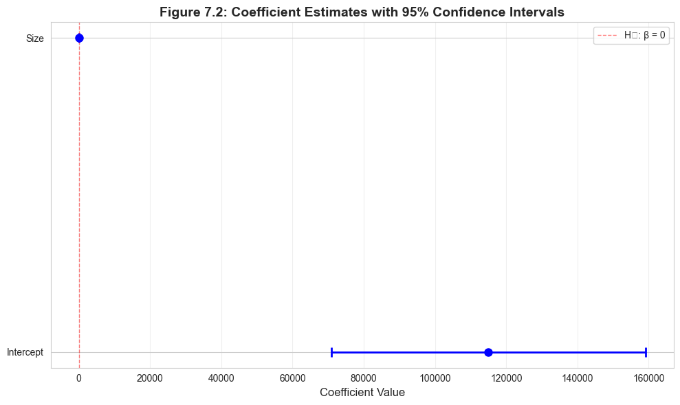 # Save coefficients in a clean tablecoef_table = pd.DataFrame({'Coefficient': model_basic.params,'Std. Error': model_basic.bse,'t-statistic': model_basic.tvalues,'p-value': model_basic.pvalues})print("\nCoefficient Table:")print(coef_table)print("\nInterpretation:")print(" - Slope (size): Each additional sq ft increases price by $73.77")print(" - Standard error: Measures uncertainty in the slope estimate")print(" - t-statistic: Tests whether slope differs from zero")print(" - p-value: Probability of observing such extreme values under H₀: β₂ = 0")