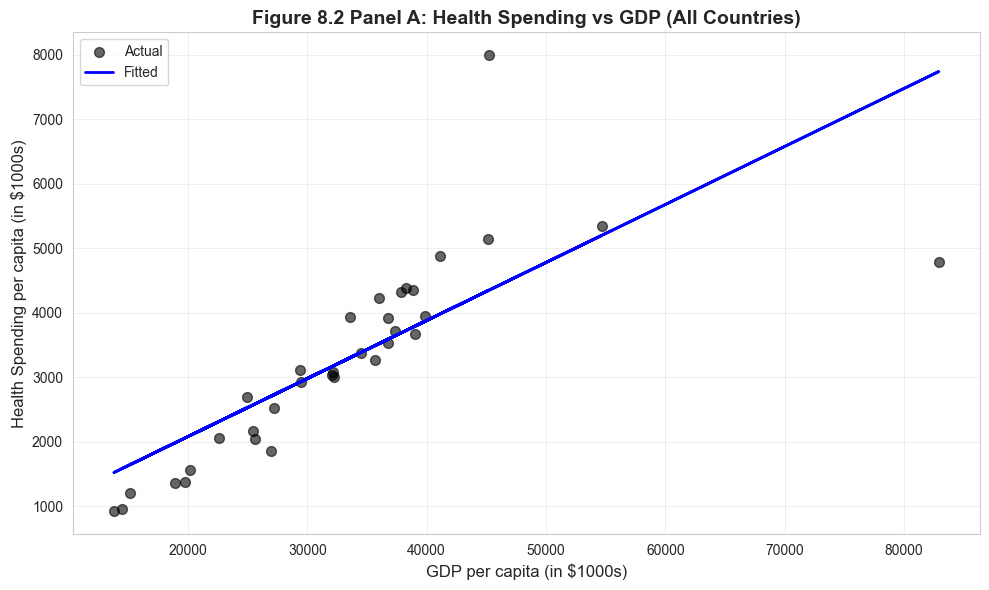 # Read in the health datadata_health = pd.read_stata(GITHUB_DATA_URL +'AED_HEALTH2009.DTA')print("="*70)print("8.1 HEALTH OUTCOMES ACROSS COUNTRIES")print("="*70)print("\nData summary:")data_summary = data_health.describe()print(data_summary)print("\nFirst few observations:")print(data_health[['code', 'hlthpc', 'lifeexp', 'infmort']].head(10))
