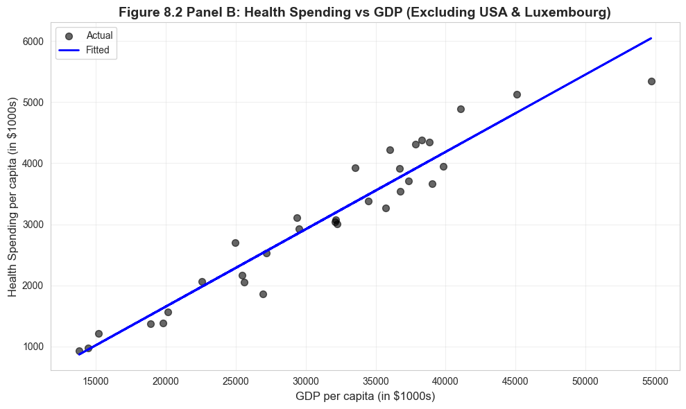 Interpretation: - \(\beta_1\): Expected life expectancy when health spending is zero (intercept) - \(\beta_2\): Change in life expectancy for each additional $1,000 in health spending - We expect \(\beta_2 > 0\) (higher spending improves outcomes)