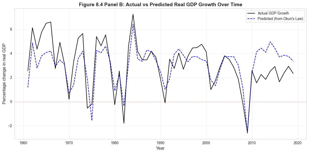 # Figure 8.4 Panel B - Time Series of Actual vs Predicted GDP Growthfig, ax = plt.subplots(figsize=(12, 6))ax.plot(data_gdp['year'], data_gdp['rgdpgrowth'], linewidth=1.5, label='Actual GDP Growth', color='black')ax.plot(data_gdp['year'], model_okun.fittedvalues, linewidth=1.5, linestyle='--', label='Predicted (from Okun\'s Law)', color='blue')ax.axhline(y=0, color='red', linestyle=':', linewidth=1, alpha=0.5)ax.set_xlabel('Year', fontsize=12)ax.set_ylabel('Percentage change in real GDP', fontsize=12)ax.set_title('Figure 8.4 Panel B: Actual vs Predicted Real GDP Growth Over Time', fontsize=14, fontweight='bold')ax.legend()ax.grid(True, alpha=0.3)plt.tight_layout()plt.show()print("\nMajor recessions visible: 1982, 1991, 2001, 2008-2009")print("Note: Post-2008 recovery shows actual GDP exceeding predictions.")