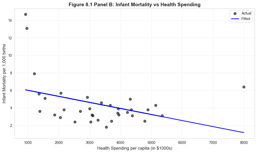 print("-"*70)print("Table 8.1: Health Variables Summary")print("-"*70)table81_vars = ['hlthpc', 'lifeexp', 'infmort']summary_table = data_health[table81_vars].describe().Tsummary_table['range'] = summary_table['max'] - summary_table['min']print(summary_table[['mean', 'std', 'min', 'max', 'range']])print("\nKey observations:")print(f" - Health spending ranges from ${summary_table.loc['hlthpc', 'min']:.0f} to ${summary_table.loc['hlthpc', 'max']:.0f}")print(f" - Life expectancy ranges from {summary_table.loc['lifeexp', 'min']:.1f} to {summary_table.loc['lifeexp', 'max']:.1f} years")print(f" - Infant mortality ranges from {summary_table.loc['infmort', 'min']:.1f} to {summary_table.loc['infmort', 'max']:.1f} per 1,000 births")