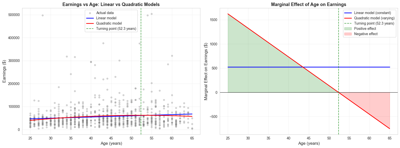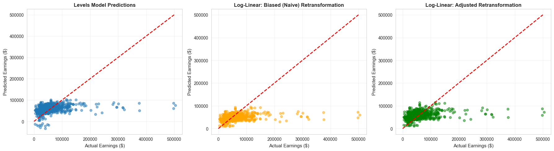 # Create comparison tableprint("\n"+"="*70)print("MODEL COMPARISON: Levels, Log-Linear, and Log-Log")print("="*70)comparison_table = pd.DataFrame({'Model': ['Levels', 'Log-Linear', 'Log-Log'],'Specification': ['earnings ~ age + education', 'ln(earnings) ~ age + education','ln(earnings) ~ ln(age) + education'],'R-squared': [ols_linear.rsquared, ols_loglin.rsquared, ols_loglog.rsquared],'Adj R-squared': [ols_linear.rsquared_adj, ols_loglin.rsquared_adj, ols_loglog.rsquared_adj]})print(comparison_table.to_string(index=False))print("\nNote: R² values are NOT directly comparable across models with different")print("dependent variables. For log models, R² measures fit to ln(earnings), not earnings.")