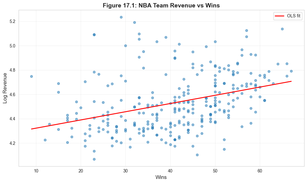 # Figure 17.1: Scatter plot with fitted linefig, ax = plt.subplots(figsize=(10, 6))ax.scatter(data_nba['wins'], data_nba['lnrevenue'], alpha=0.5, s=30)# Add OLS fit linez = np.polyfit(data_nba['wins'], data_nba['lnrevenue'], 1)p = np.poly1d(z)wins_range = np.linspace(data_nba['wins'].min(), data_nba['wins'].max(), 100)ax.plot(wins_range, p(wins_range), 'r-', linewidth=2, label='OLS fit')ax.set_xlabel('Wins', fontsize=12)ax.set_ylabel('Log Revenue', fontsize=12)ax.set_title('Figure 17.1: NBA Team Revenue vs Wins', fontsize=14, fontweight='bold')ax.legend()ax.grid(True, alpha=0.3)plt.tight_layout()plt.show()print("Positive relationship: More wins associated with higher revenue.")