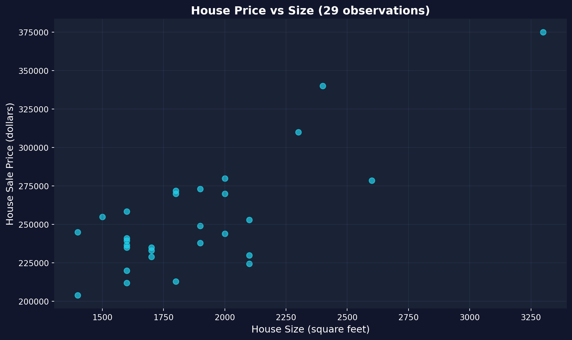 - Variables: price (sale price in dollars), size (house size in square feet), plus 7 other characteristics