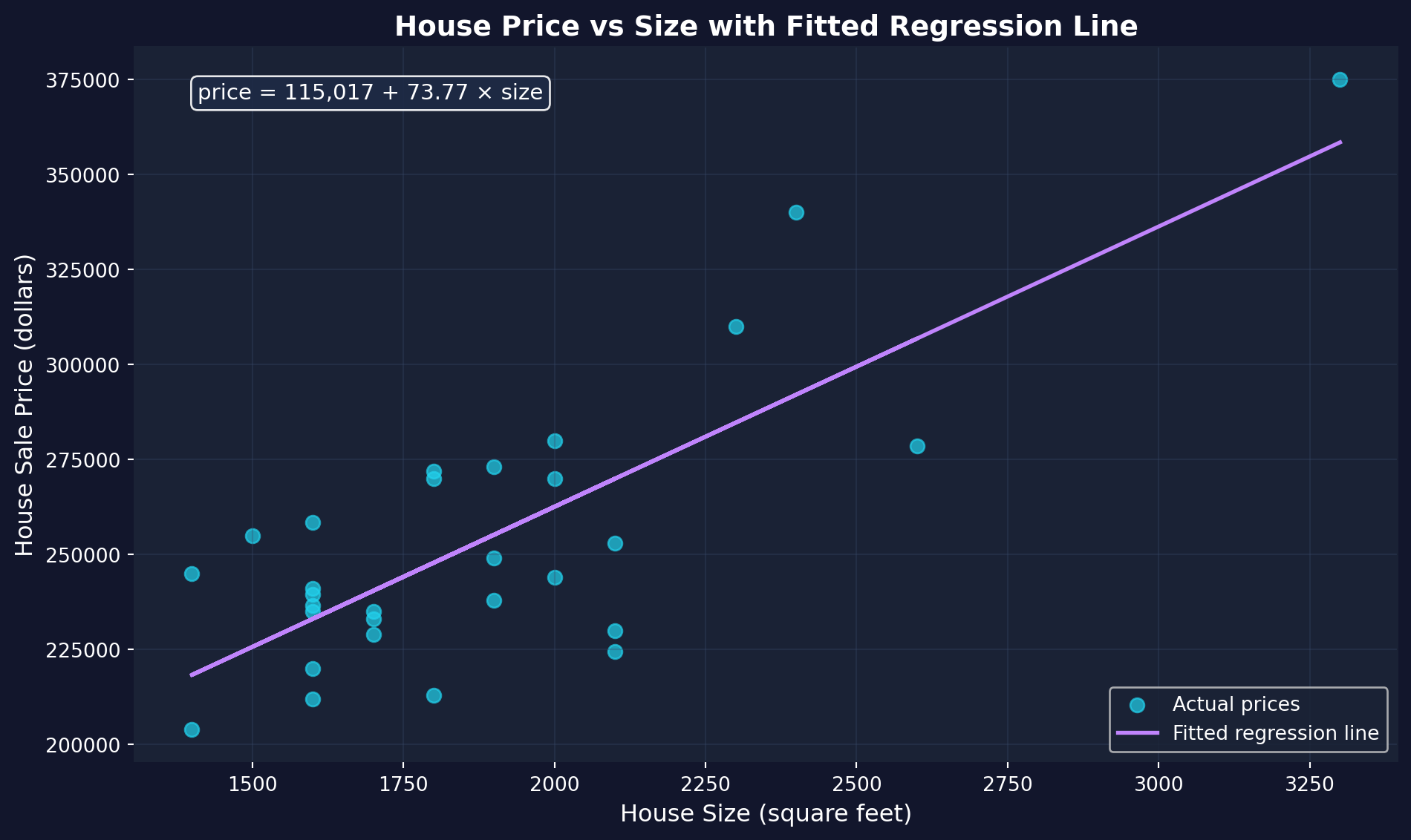 **The regression line** is the "line of best fit" that minimizes the sum of squared distances between actual prices and predicted prices. The mathematical form is: