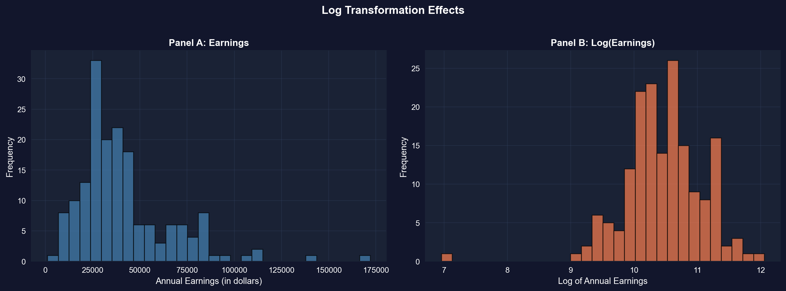 **Apply what you learned in section 2.5**: Log transformations convert multiplicative relationships into additive ones and reduce skewness.
