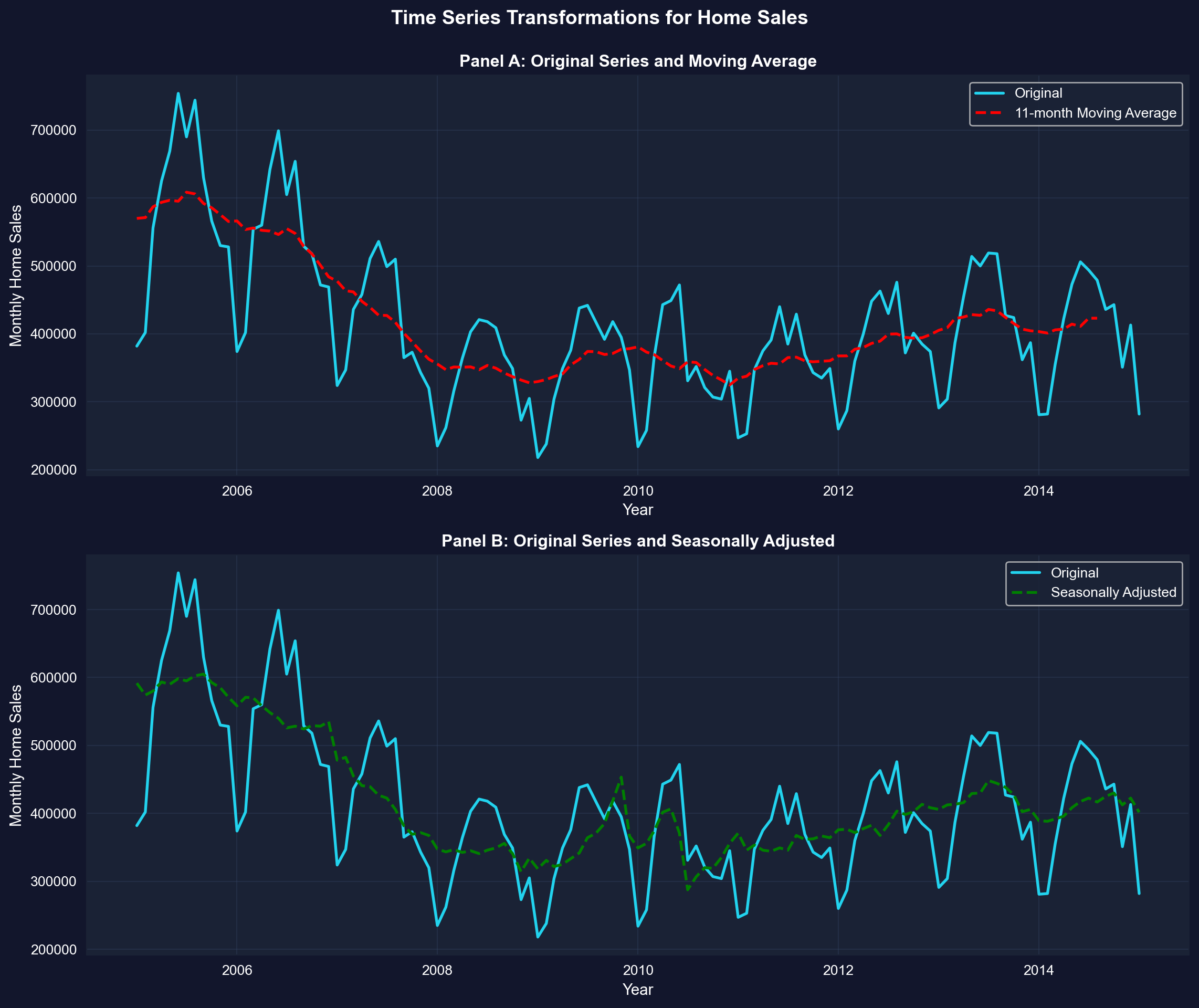 - Work with time series transformations (moving averages, seasonal adjustment)
