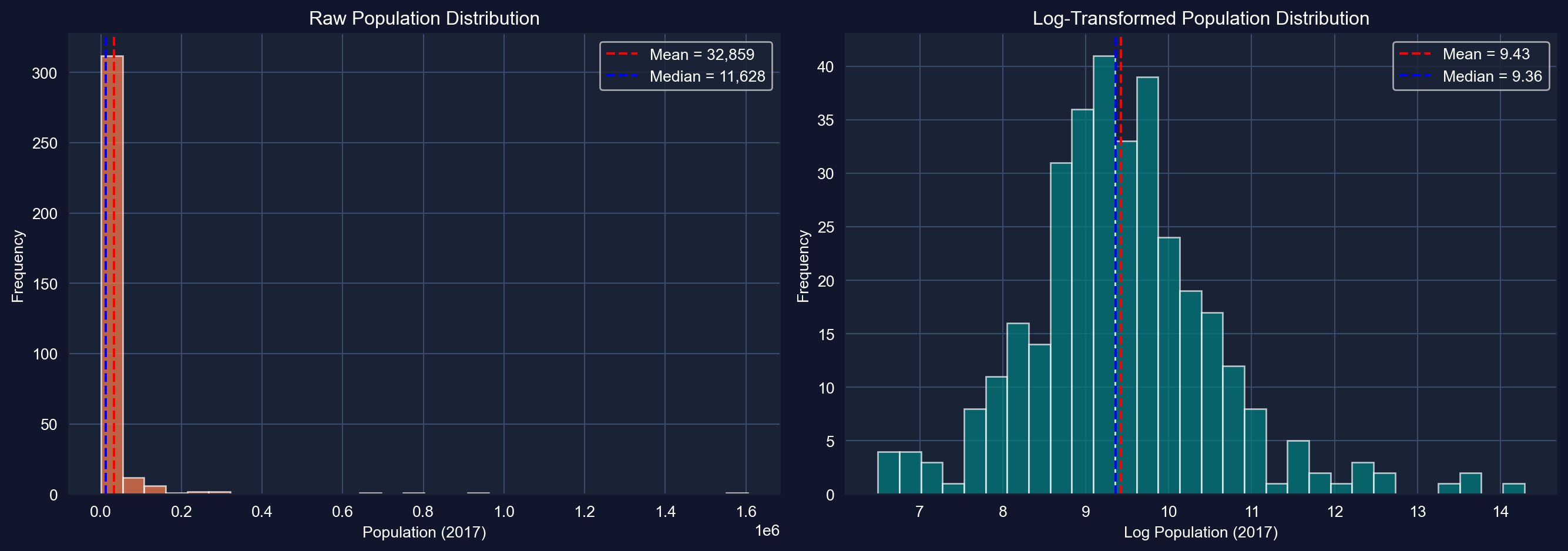 **Objective**: Compare the distribution of raw population (`pop2017`) with its log transformation to demonstrate how log transformations improve symmetry for skewed data.