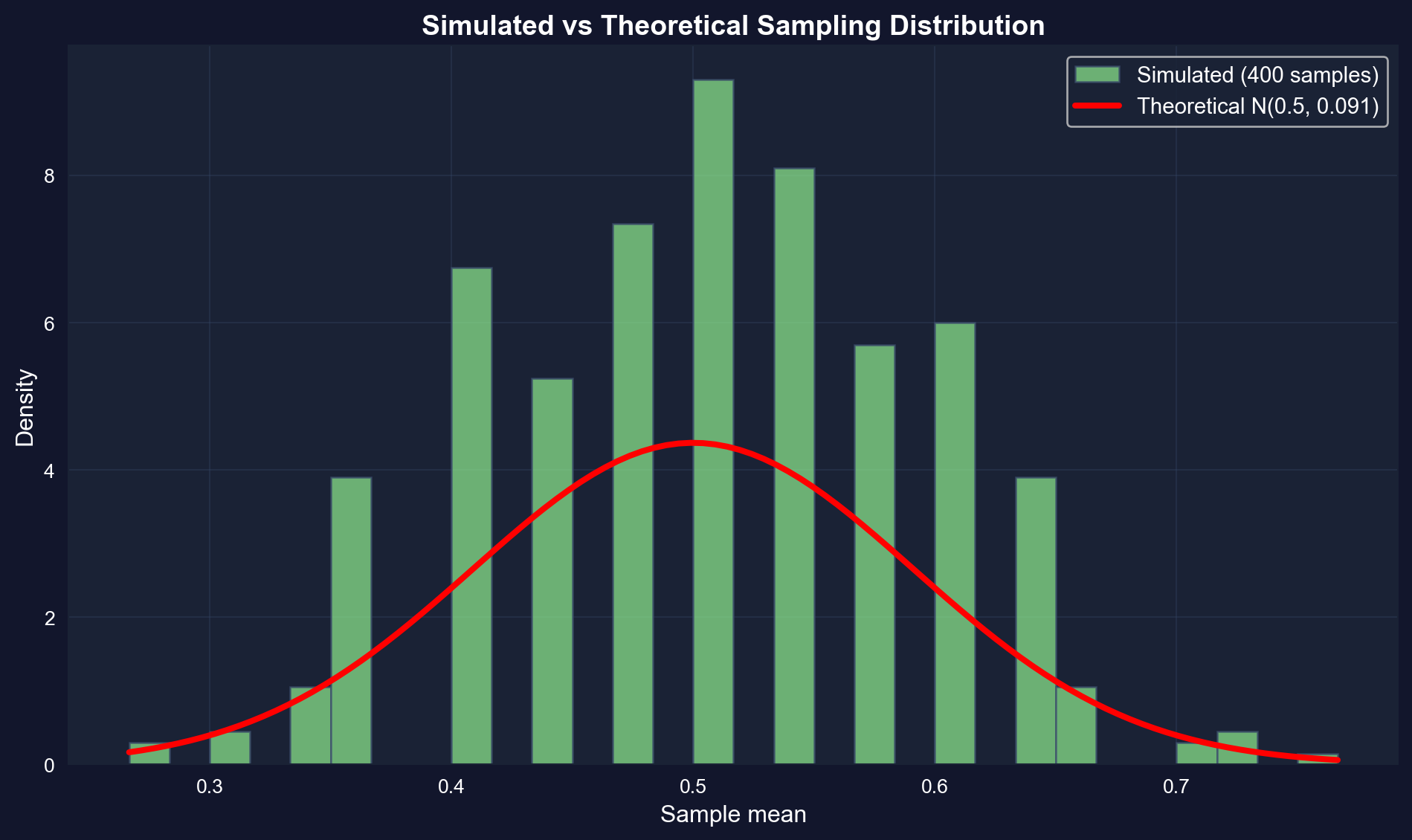 **Sampling distribution**: Simulated and visualized the distribution of sample means