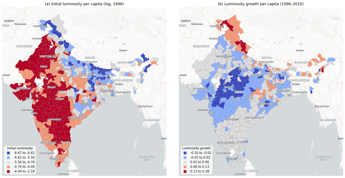 The interactive choropleth below maps per capita luminosity growth across all 520 districts. Hover over individual districts to inspect their values.
