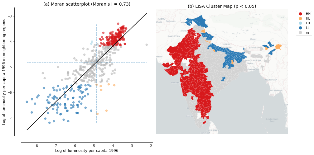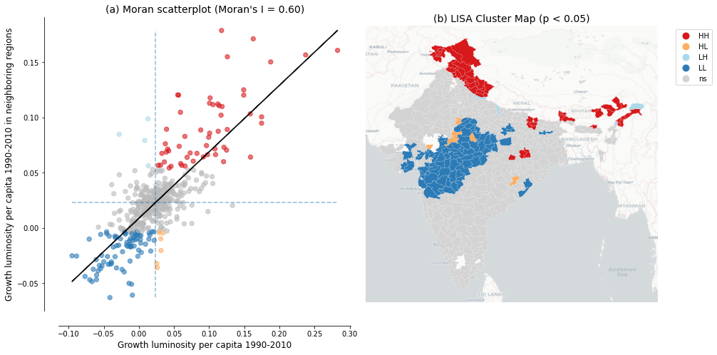 pass # Local environment — packages already installedThis notebook examines spatial dependence in nighttime luminosity across 520 Indian districts using Local Indicators of Spatial Association (LISA). We apply Local Moran’s I to both the initial level and the growth rate of luminosity per capita, and visualize the results as cluster maps identifying statistically significant spatial clusters (HH, LL) and outliers (HL, LH).